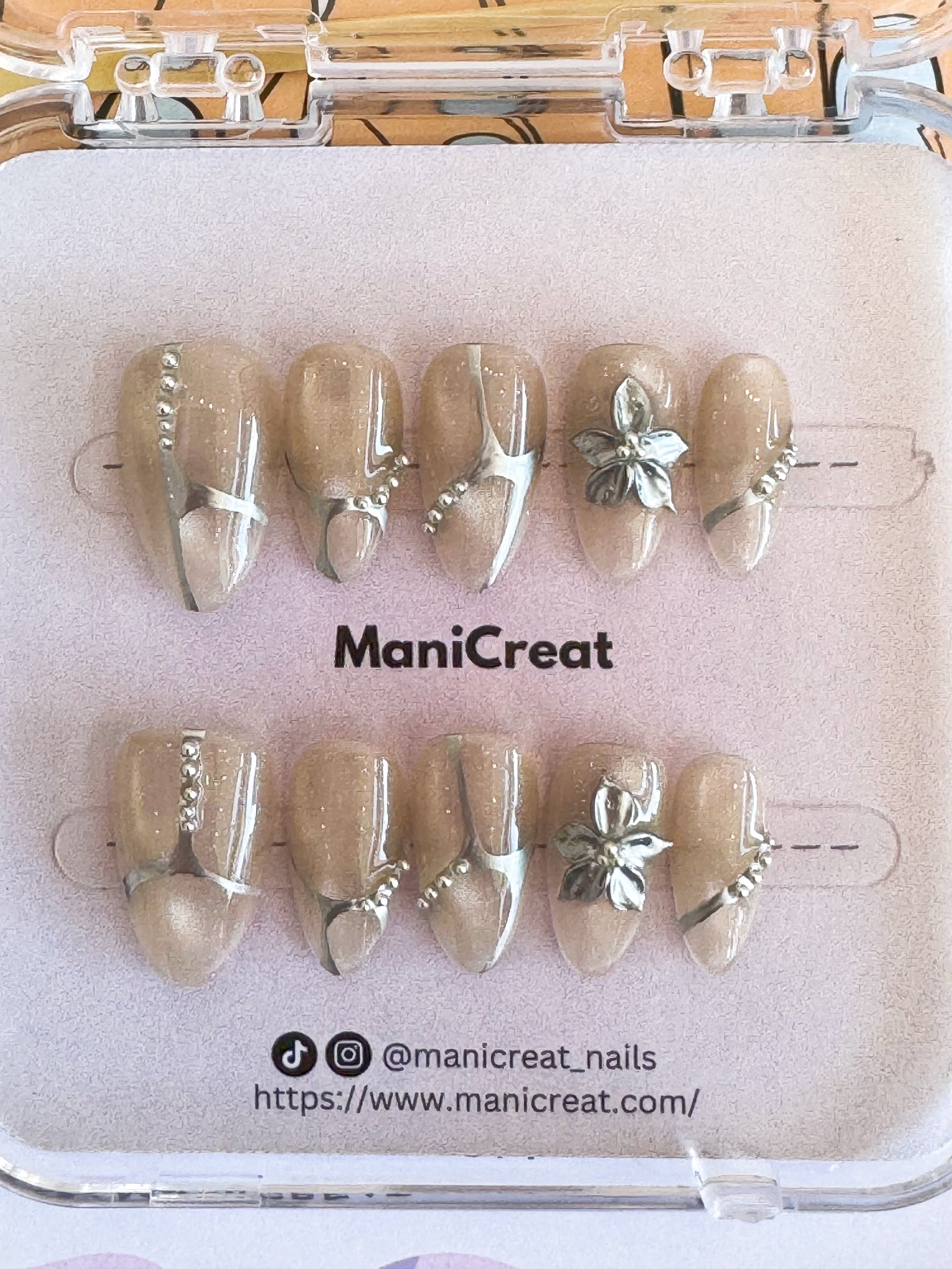 An avant-garde fusion of metallic elegance and floral artistry. Nude shimmer bases are adorned with sculptural chrome lines, crystal details, and a striking silver blossom centerpiece. Chrome Fleur is couture-inspired, bold yet refined — a statement of modern femininity with an edge.