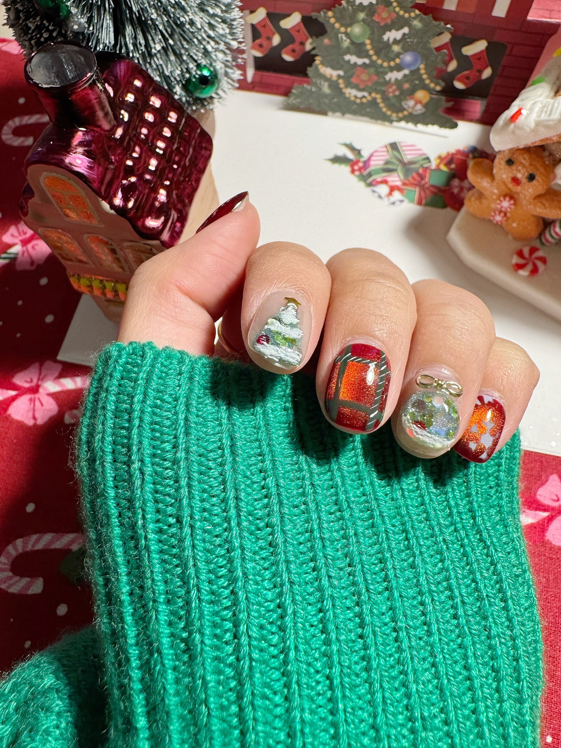 Bring the warmth of Christmas to your fingertips with this hand-crafted festive set. Deep wine red, shimmering snowflakes, cozy plaid, and tiny 3D Christmas trees come together to capture the magic of the holiday season. Each piece is detailed with reflective glitter, crystal ornaments, and a mini snow-globe charm effect—perfect for anyone who loves a touch of sparkle.