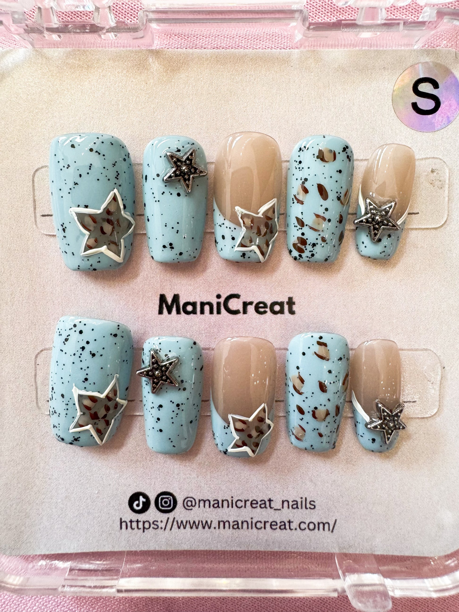 A playful collision of color and cosmos — sky-blue speckled polish meets bold leopard accents and shimmering star charms. Galaxy Pop is trendy, fun, and fearless, bringing a pop of cosmic energy to your fingertips.