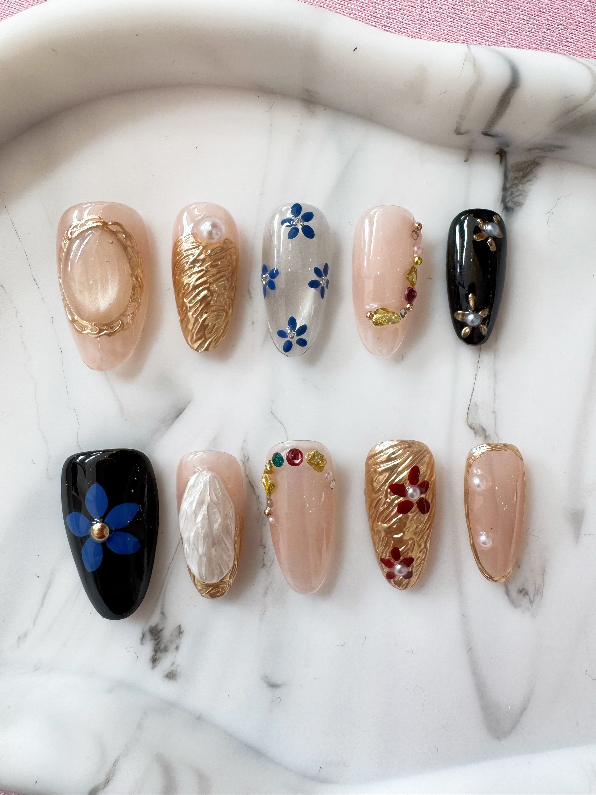 This elegant nail set blends modern chic with timeless artistry. Featuring a nude base enhanced with molten gold textures, delicate pearl accents, and gemstone embellishments, the design radiates sophistication. Bold blue and red florals contrast gracefully against soft pinks and jet black, creating a balance of playful charm and luxurious refinement. Perfect for those who love statement details while keeping an air of elegance, Golden Bloom Symphony is where art and glamour meet at your fingertips.