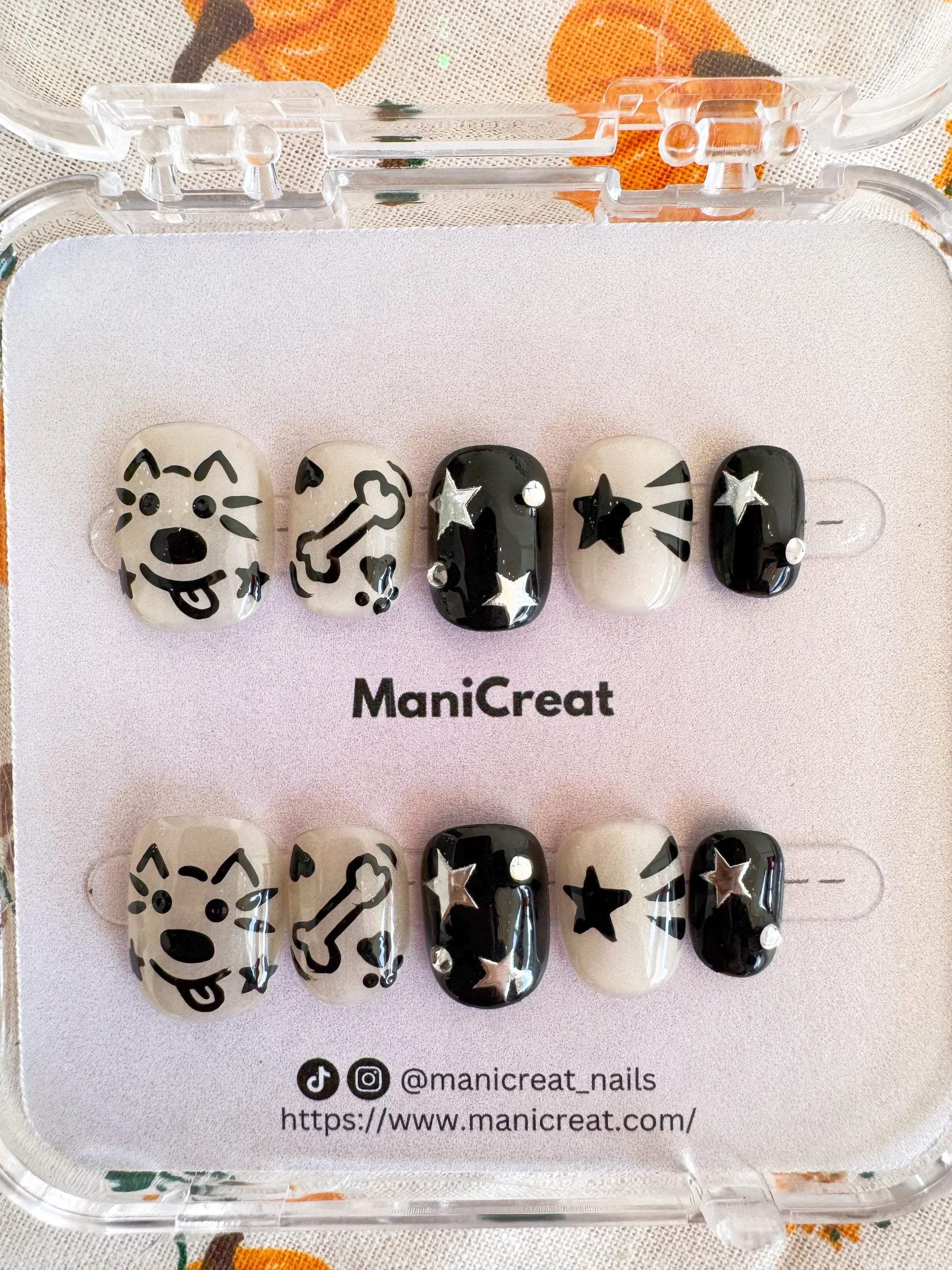 Playful pups meet cosmic sparkle — this nail set features cute dog faces, paw bones, and shining stars in a chic black-and-white palette. Puppy Stardust is perfect for animal lovers with a fun, edgy twist, bringing both cuteness and starry glam to your fingertips.