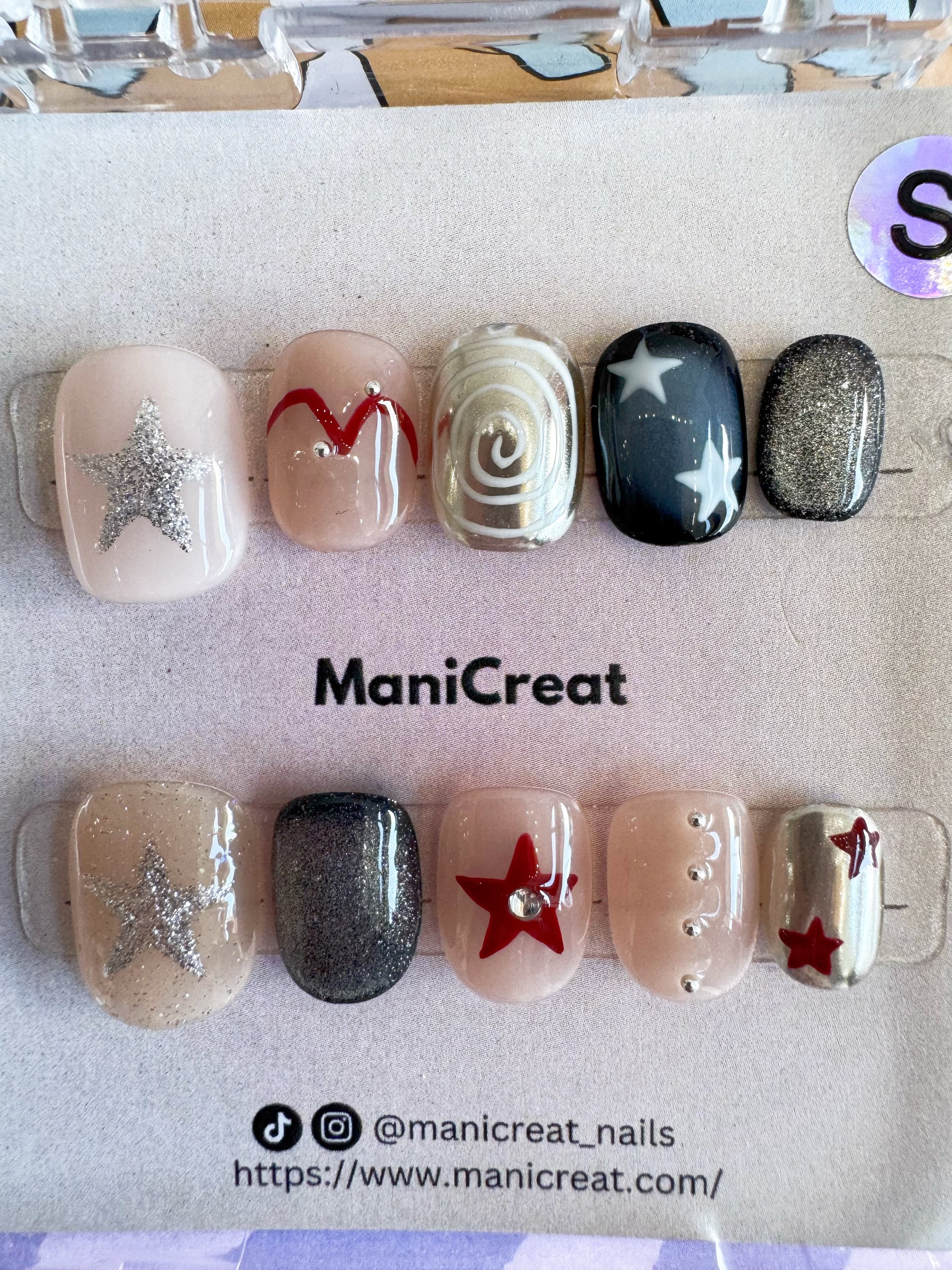 Playful stars, metallic swirls, and pops of red ignite this cosmic-inspired design. Stellar Reverie balances fantasy and boldness, capturing the magic of starlit dreams with a modern edge.