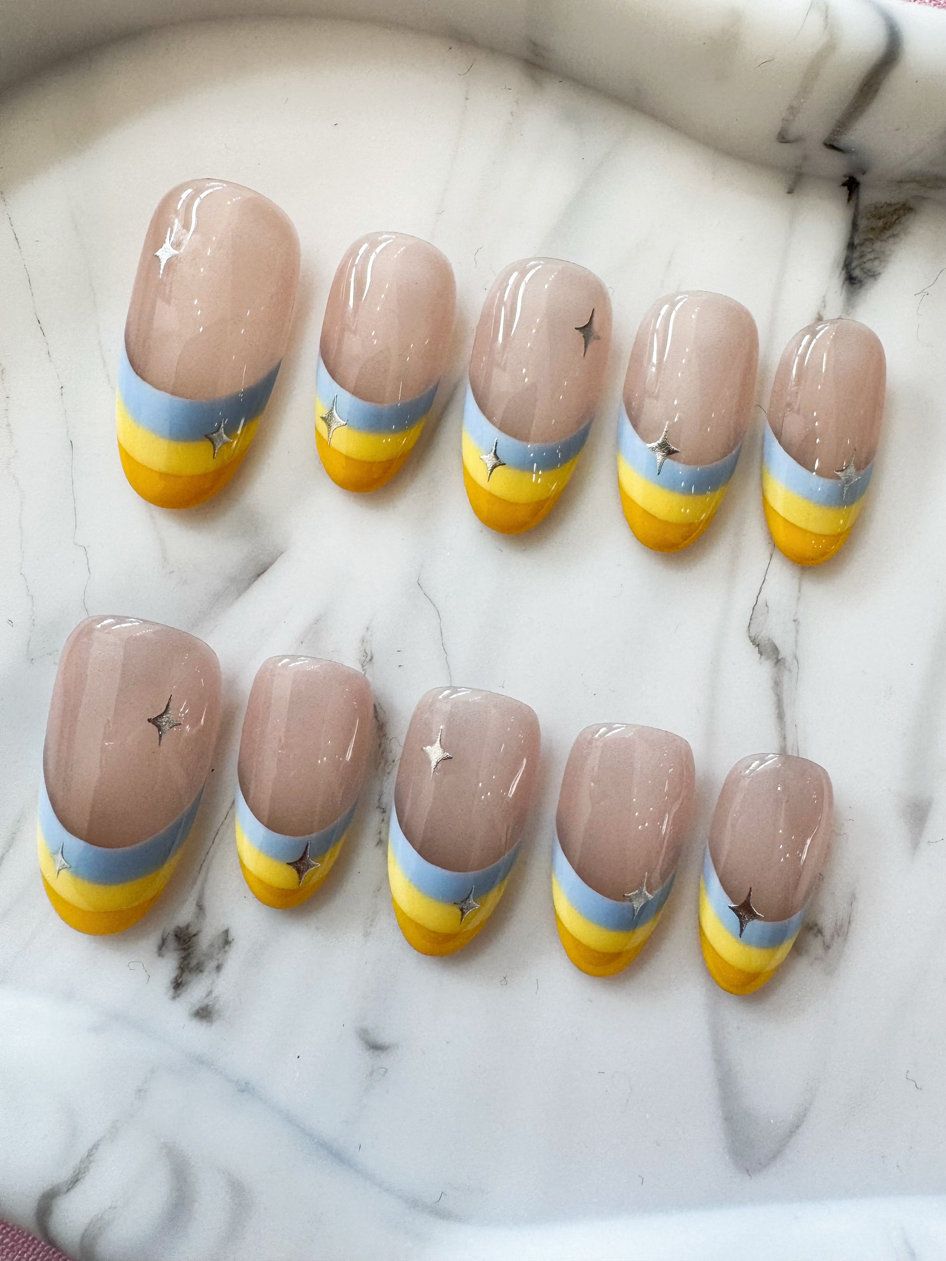 Inspired by glowing skies at dusk, this set layers soft lavender-nude with bands of yellow and sky blue, finished with delicate silver starbursts. A dreamy gradient that feels like carrying a summer sunset at your fingertips.